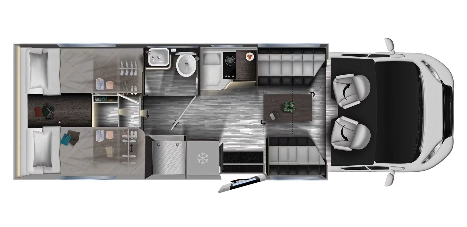 - Einzelbetten im Heck mit viel Stauraum